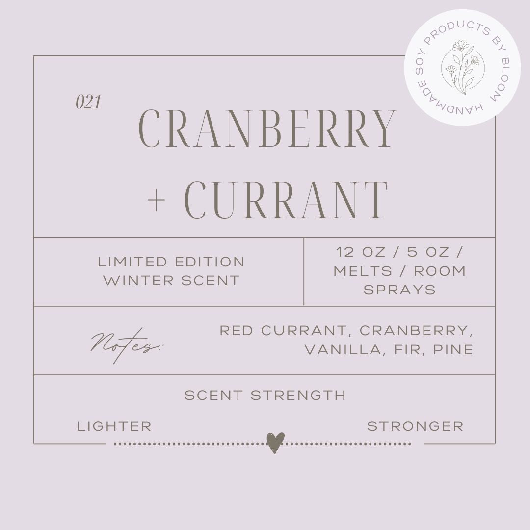 Cranberry + Currant combines the tartness of cranberries and currants with pleasing herbaceous accords. Freshen up your space with this unique holiday fragrance!