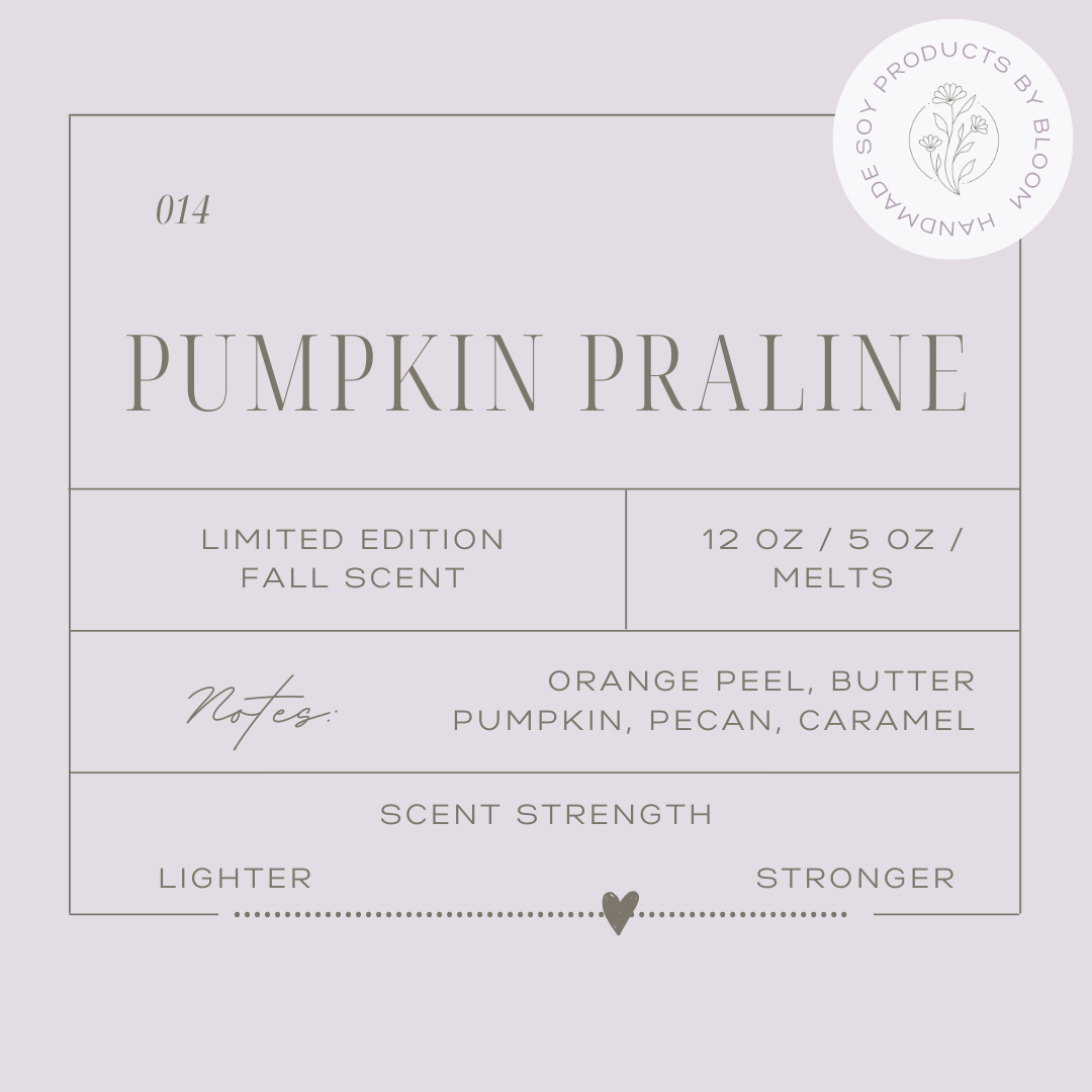 Pumpkin Praline is our sweet take on your traditional pumpkin scent. Heavy on the caramel and nutty notes, this fragrance will fill any space with mouth watering decadence.